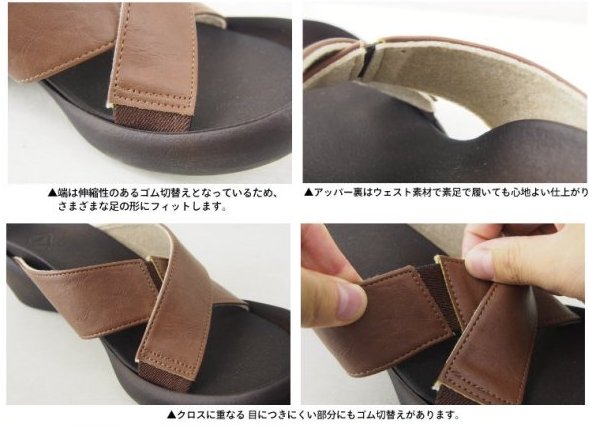 太めのベルトで足を覆うため、密着度も高く、脱げにくいのが嬉しい!中央と端の一部をゴムで切り替えているので、幅広、甲高さんにも履きやすいデザインに仕上げています。