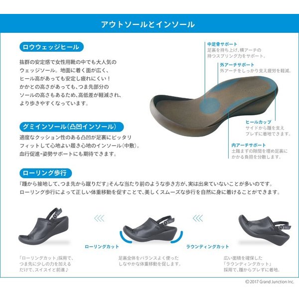 ■凸凹した構造のグミインソールは、血行促進をサポートし、歩き疲れや冷え・むくみ防止に役立ちます。正しい歩き方を促し、姿勢サポート効果にも期待できる構造となっております。