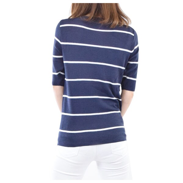 ボーダー柄ボートネック薄手シンプル五分袖ニットソー レディーストップス | 細ボーダー柄がすっきり大人女子な着こなしに☆
