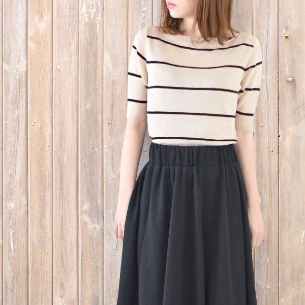 - ボーダー柄ボートネック薄手シンプル五分袖ニットソー レディーストップス