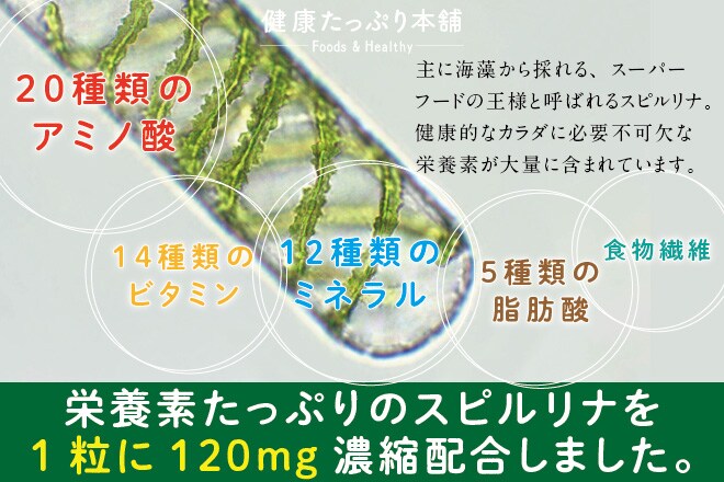 栄養素たっぷりのスピルリナを、1粒に120mg濃縮配合しました。