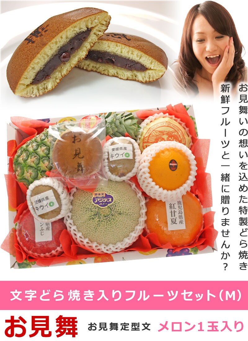 - 文字どら焼き入りフルーツセット M【お見舞】メロン入り 果物の詰め合わせ 贈答用 贈り物