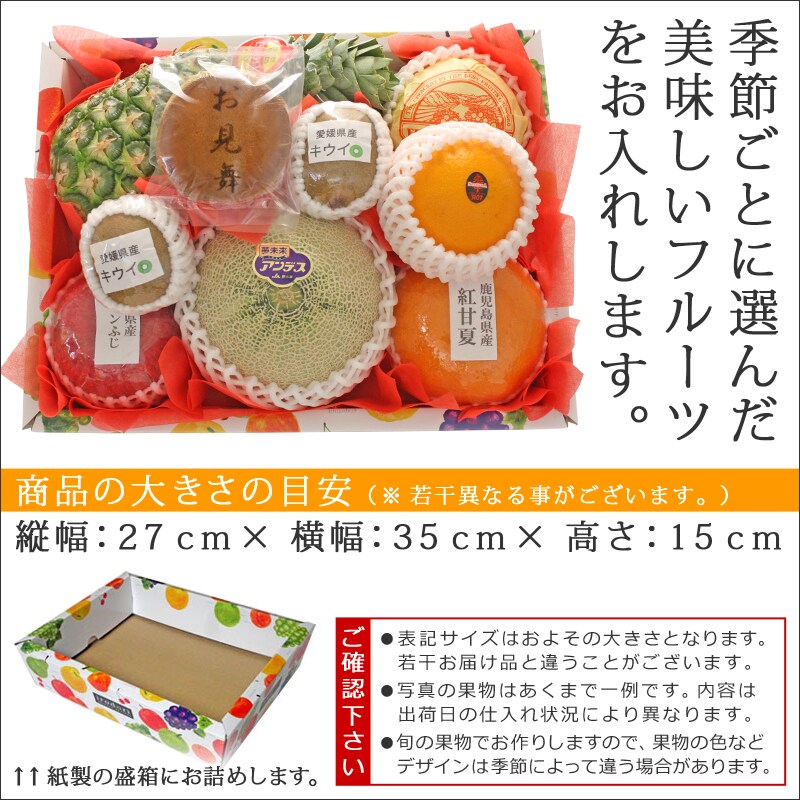 パイナップル、オレンジの他、リンゴなどをお入れしております。また、こちらの商品には、季節ごとに選んだ美味しいメロンをお入れしております。