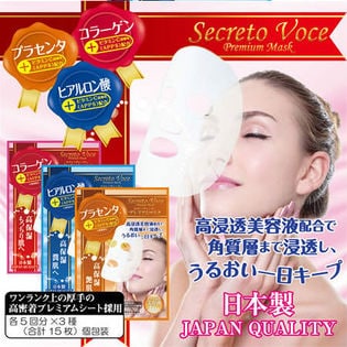 【3種合計15枚】セクレトヴォーチェプレミアムマスク (プラセンタ・ヒアルロン酸・コラーゲン) | 厚手の高密着プレミアムシートを採用した、とっておきの個包装タイプの日本製フェイスマスク