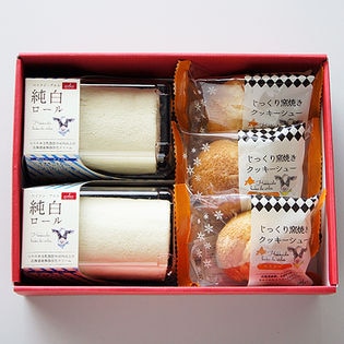 しっとりスポンジ生地に濃厚な北海道産純生クリームを贅沢に包み込んだ、真っ白なロールケーキと特製クッキー生地をのせて香ばしく焼き上げたシュークリームをギフトセットにしました。