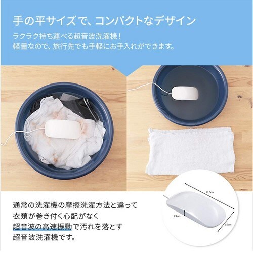 手の平サイズの軽量コンパクトでラクラク持ち運べる超音波洗濯機!