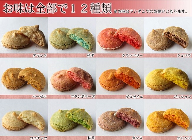 ・原材料/材質/素材:卵、アーモンド、砂糖、バター、植物性油脂、木苺、グロゼイユ、クランベリー、ヘーゼルナッツ、カカオマス、ゆず、オレンジ、ココナッツ、カシス、パッション、抹茶、小麦粉、クチナシ色素、紅麹色素