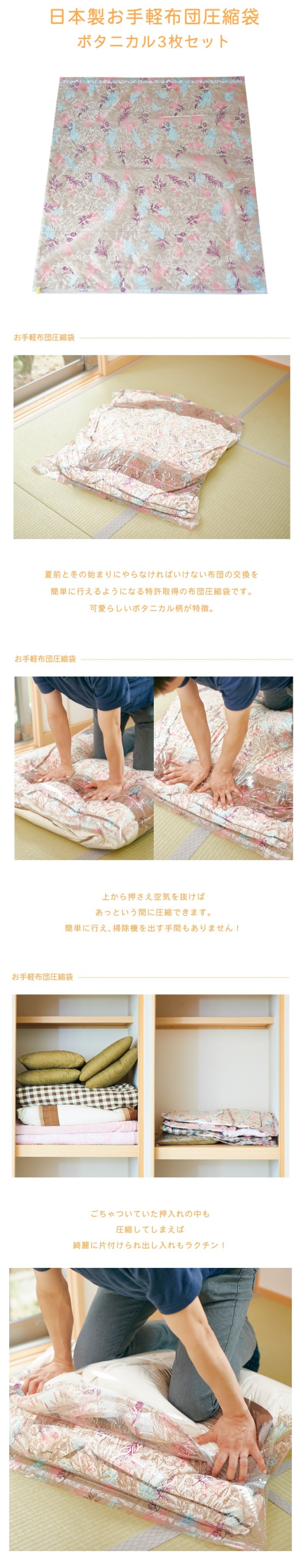 【3枚セット/ボタニカル】お手軽布団圧縮袋 | 掃除機なしで簡単に使える布団圧縮袋。