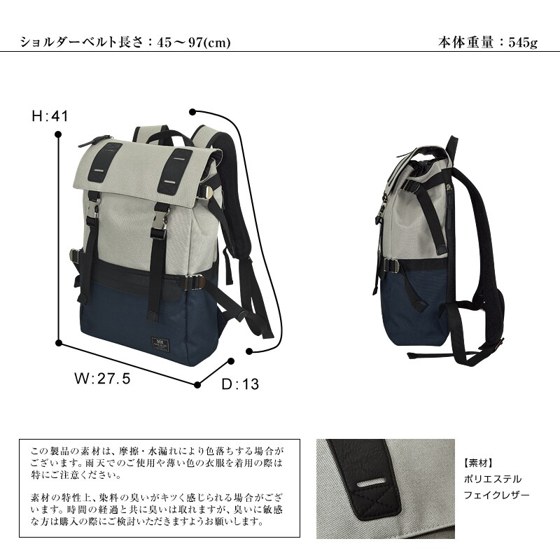 マルチに使えるサイジング♪スクエアフォルムのフラップリュックサック。しっかり収納ができて、通勤や通学にも最適です。開閉はフラップ仕様。開口部は安 心のドローコードになっています。背面のファスナーからも荷物の出し入れが可能。内側にはクッション素材入りのPCルームが付いています!両サイドには オープンポケットを装備。フラップ部分はファスナーポケットになっています。フロント下部にもポケットを装備。ハーネス付きのショルダーベルトで、肩から のズリ落ちも防止してくれます。男女で使えるプレーンなデザインのスクエアリュックサック。