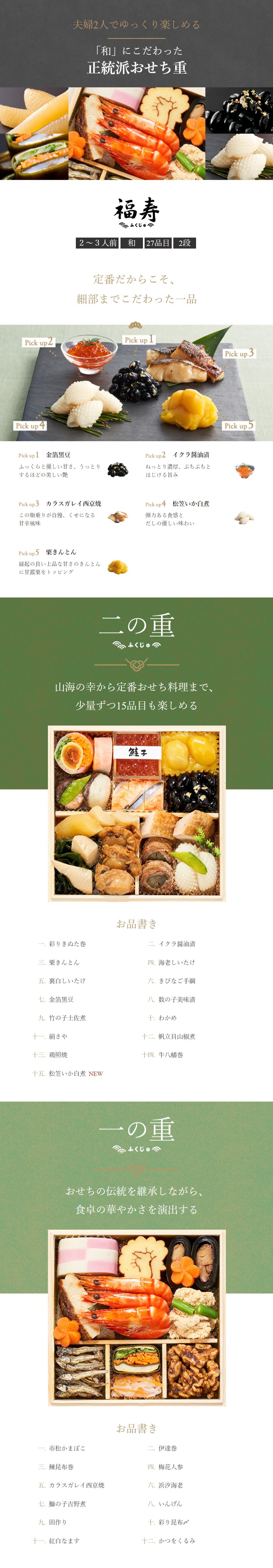 【壱の重】市松かまぼこ,伊達巻,鰊昆布巻,梅花人参,カラスガレイ西京焼,浜汐海老,鰤の子吉野煮,いんげん,田作り,彩り昆布〆,紅白なます,かつをくるみ【弐の重】彩りきぬた巻,イクラ醤油漬,栗きんとん,海老しいたけ,裏白しいたけ,きびなご手綱,金箔黒豆,数の子美味漬,竹の子土佐煮,わかめ,絹さや,帆立貝山椒煮,鶏照焼,牛八幡巻,松笠いか白煮