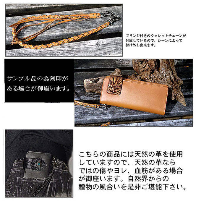 ヴィンテージレザーの様な深みのある色合いが渋いロングウォレット。彫り込まれているようなデザインのカーヴィング調がワンポイント。デニムにも相性抜群の、チェーン付き!