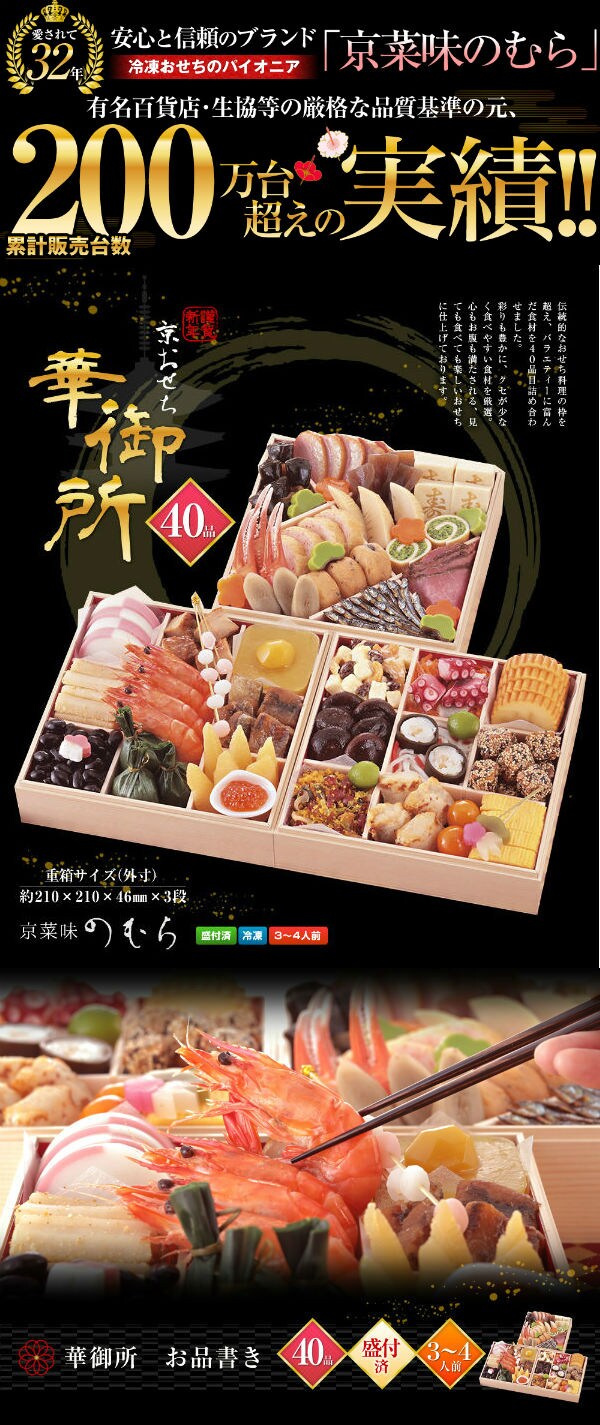 【12/29午後着】【3人前-4人前/40品目】京菜味のむら 京のおせち「華御所」三段重 | 心もお腹も満たされる、見ても食べても楽しいおせち。