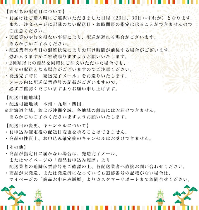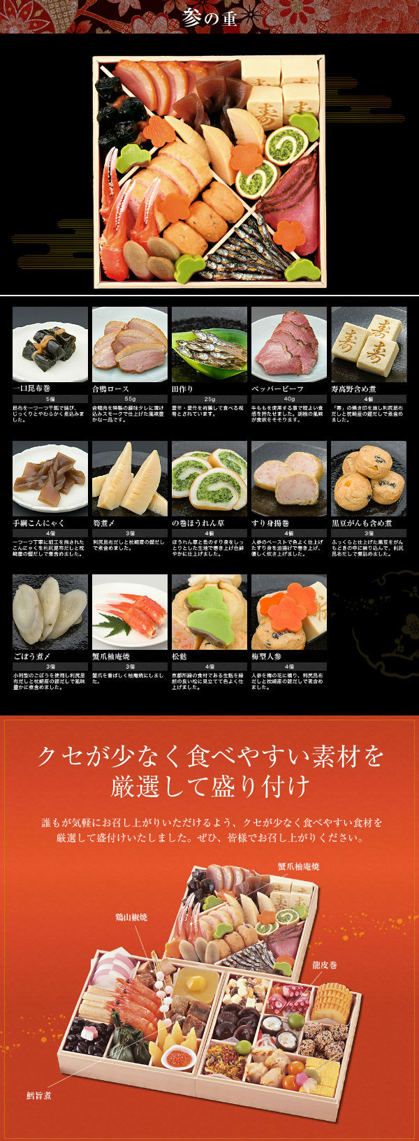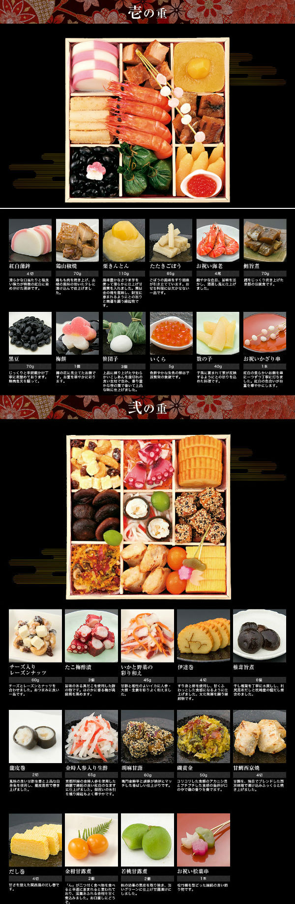 ・お召し上がり方:化粧箱からお重を1段ずつ取り出し、パックしたまま冷蔵庫で約17時間、解凍してください。解凍後は、なるべく早くお召し上がりください。