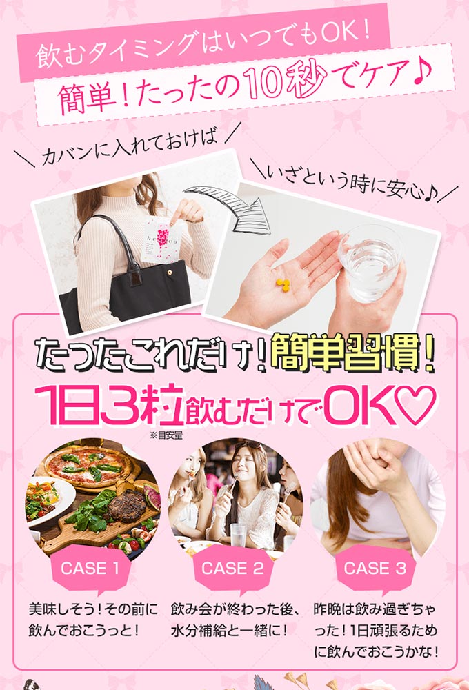 飲みすぎ食べ過ぎ徹底サポート! 女子の強い味方「へパコ」が登場☆ へパコには女子に嬉しい ダイエットサポート成分 美容成分 口臭カバー成分をたっぷり配合! へパコで女子力を高めましょう♪