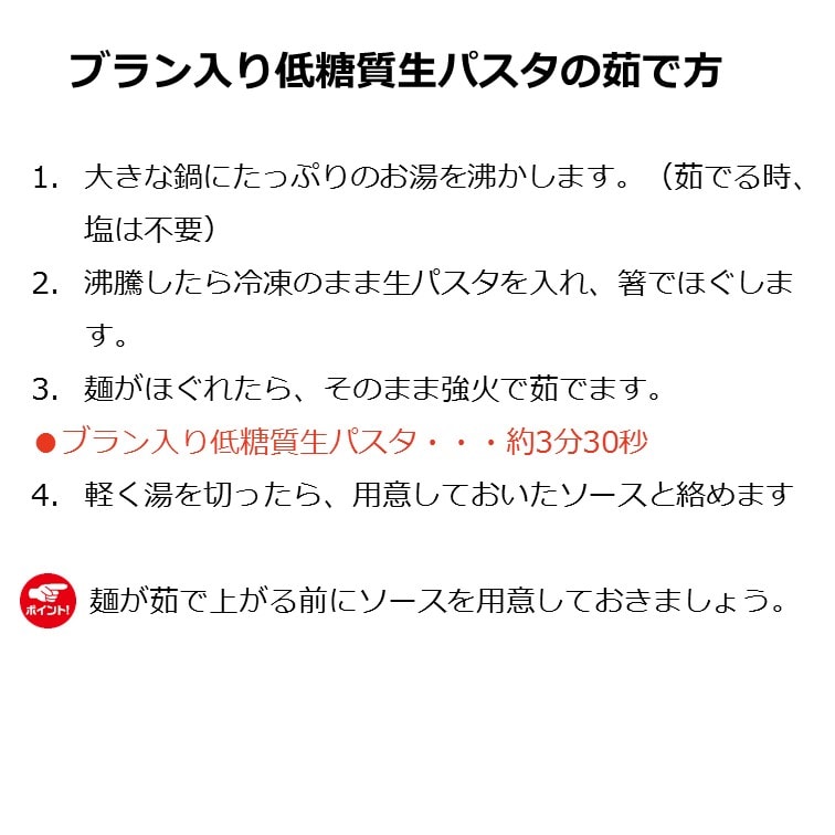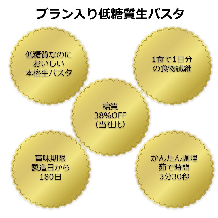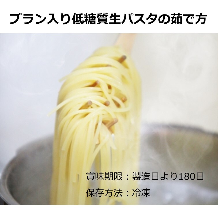 ブラン入り低糖質生パスタ:デュラム小麦、小麦たん白、加工でんぷん、乾燥卵白粉、乾燥卵黄粉、ふすま、食塩、酒精、増粘剤(原材料の一部に小麦、卵を含む)