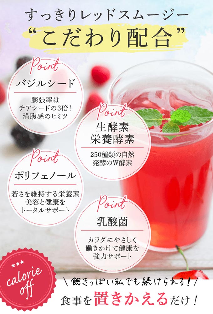 【レッドスムージー】難消化性デキストリン、アカシア食物繊維、還元麦芽糖水飴、グルコマンナン、赤ブドウ発酵エキス末、粉末油脂(植物油脂、乳糖、デキストリン)、クランベリー果汁粉末(デキストリン、クランベリー果汁)、フルーツ野菜エキス粉末(ブドウ、トマト、人参、ビルベリー、茶葉、グレープフルーツ、小麦麦芽、パパイヤ、パイナップル、イチゴ、リンゴ、アプリコット、さくらんぼ、オレンジ、ブラックカラント、ブロッコリー、キャベツ、玉ねぎ、にんにく、オリーブ、きゅうり、アスパラガス)、 植物発酵エキス粉末(デキストリン、甜菜糖、黒砂糖、麦芽糖、その他)、野草発酵エキスパウダー[デキストリン野草発酵エキス(オリゴ糖、砂糖、てんさい糖、ヨモギ、その他)]、植物発酵物粉末[難消化性デキストリン、植物発酵エキス(黒糖、りんご、玄米麹、その他)]、赤ショウガエキス、乳酸菌(殺菌)、バジルシード/クエン酸、甘味料(ステビア)、紅麹色素、香料、増粘剤(グァーガム)、ビタミンC、ナイアシン、ビタミンE、パントテン酸カルシウム、シクロデキストリン、ビタミンB1、ビタミンB6、ビタミンA、ビタミンB2、葉酸、ビタミンD、ビタミンB12(一部に乳成分・小麦・リンゴ・オレンジ・バナナ・モモ・キウイフルーツ・大豆・やまいもを含む)