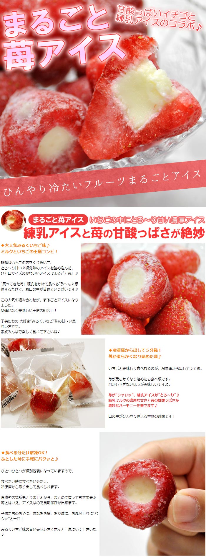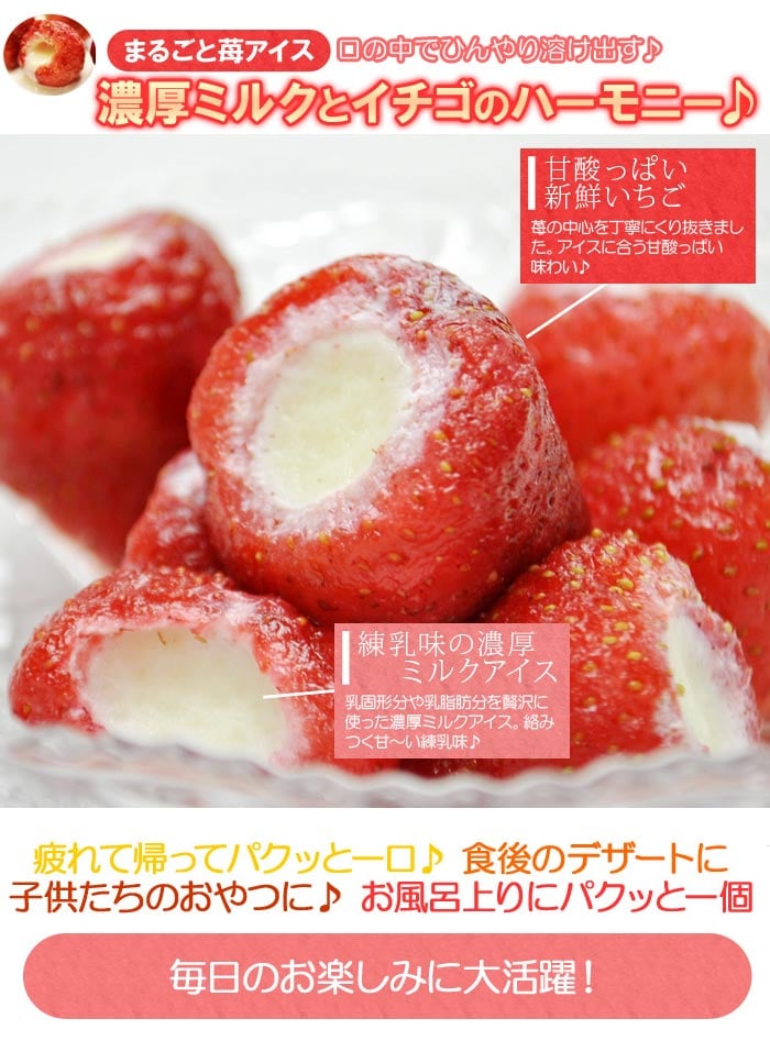 【30粒入り】まるごとアイス いちご 苺の芯をくり抜いて練乳アイスを詰めましたギフトにも最適です! | まるごと苺の中にあまい練乳アイス入り個包装で食べたい分だけ取り出せる!
