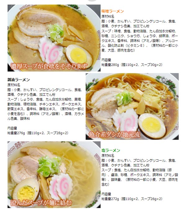 スープ:味噌、食塩、動物油脂、たん白加水分解物、砂糖、ニンニク、ショウガ、しょうゆ、胡麻油、ポークエキス、香辛料、調味料(アミノ酸等)、アルコール、酸化防止剤(ビタミンE)