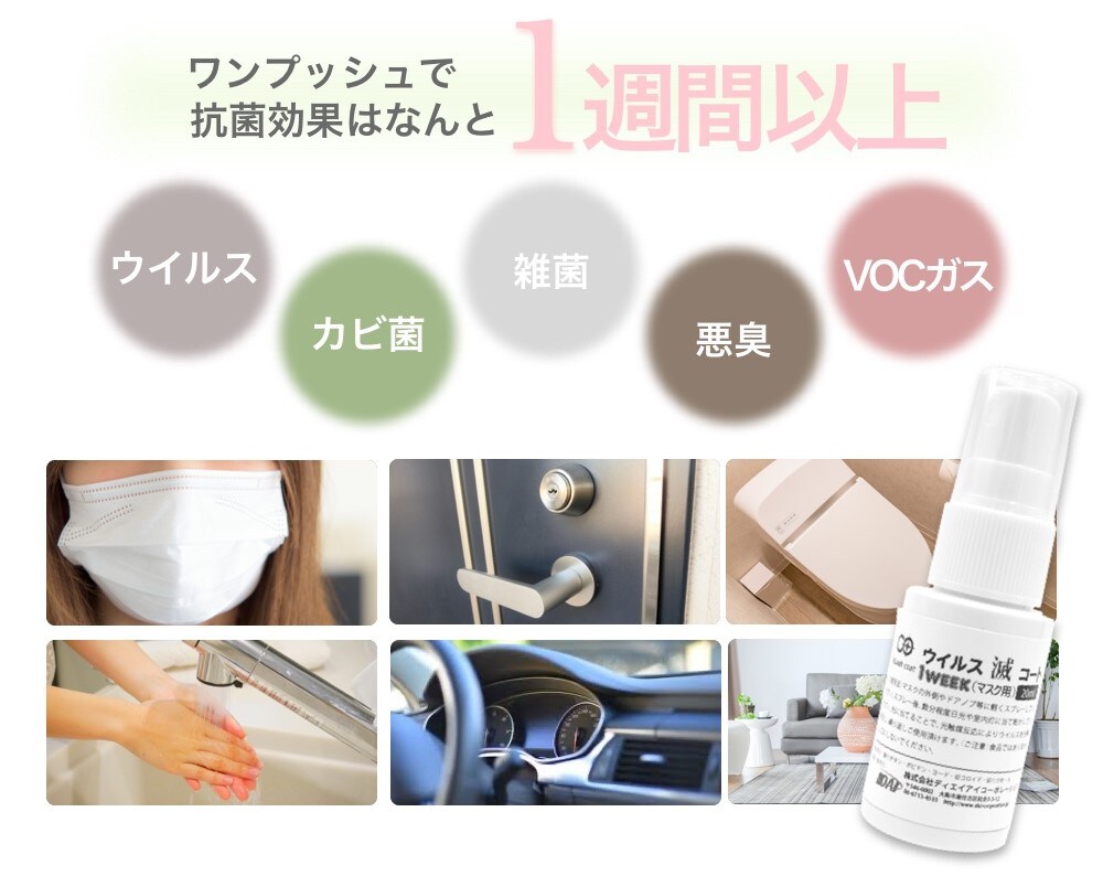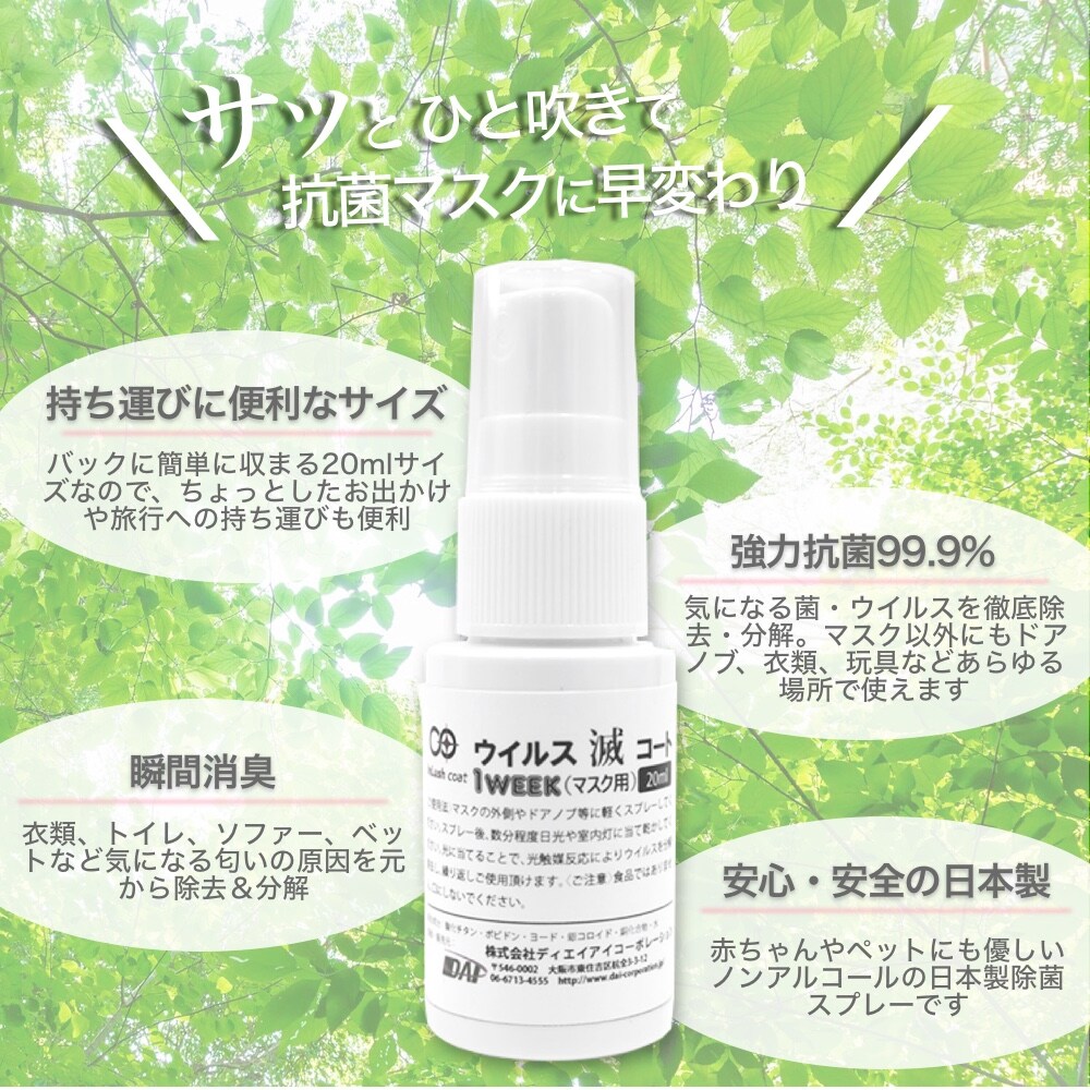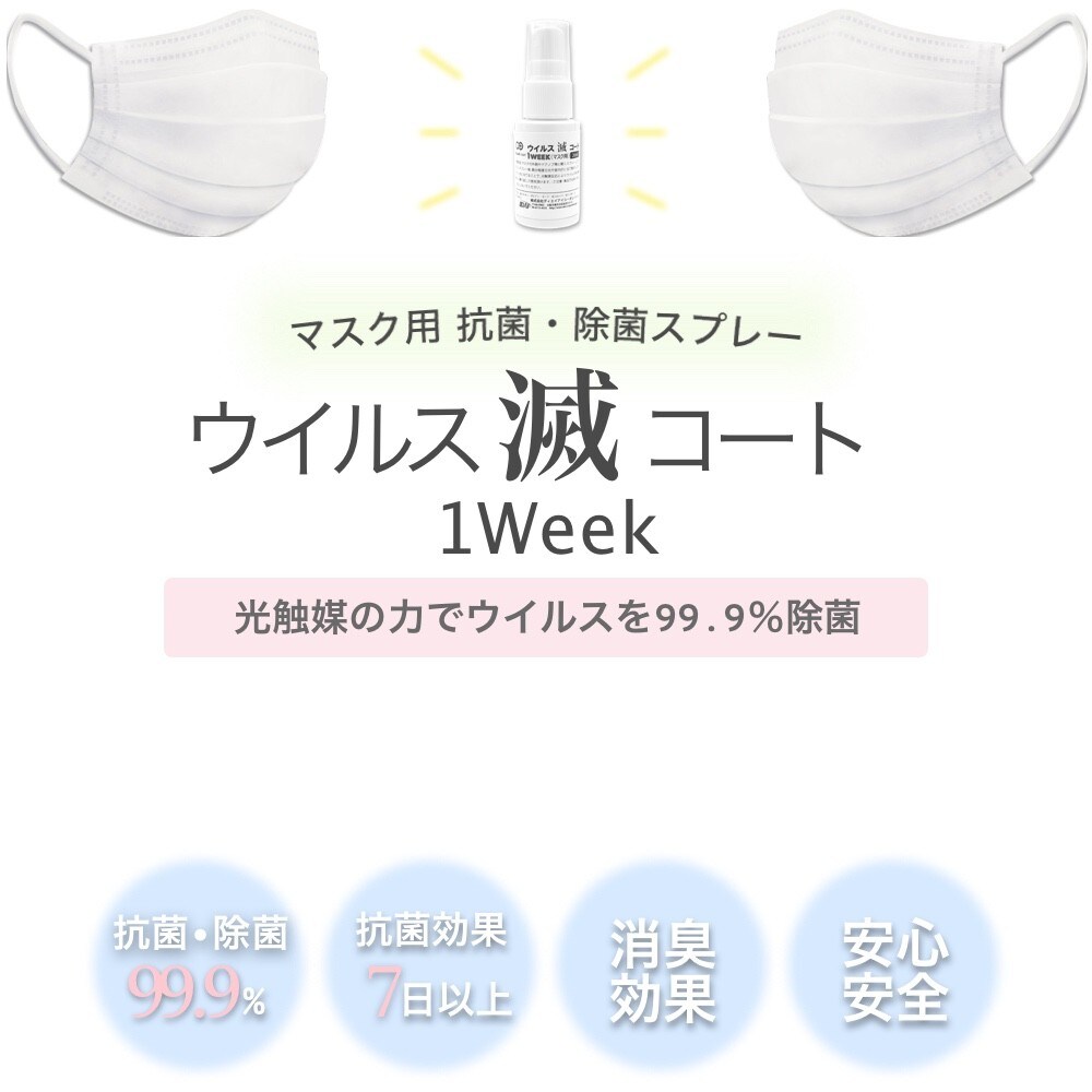 【2本セット】ウイルス対策 抗菌スプレー マスク用「ウイルス滅コート 1Week」 | 金属イオン+光触媒の力で抗菌・除菌効果は1週間以上!ウイルス・菌を元から99.9%除去!