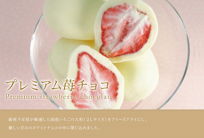 銀座千疋屋が厳選した国産いちごの大粒(2Lサイズ)をフリーズドライにし、優しい甘みのホワイトチョコの中に閉じ込めました!