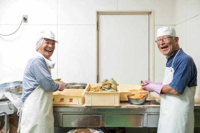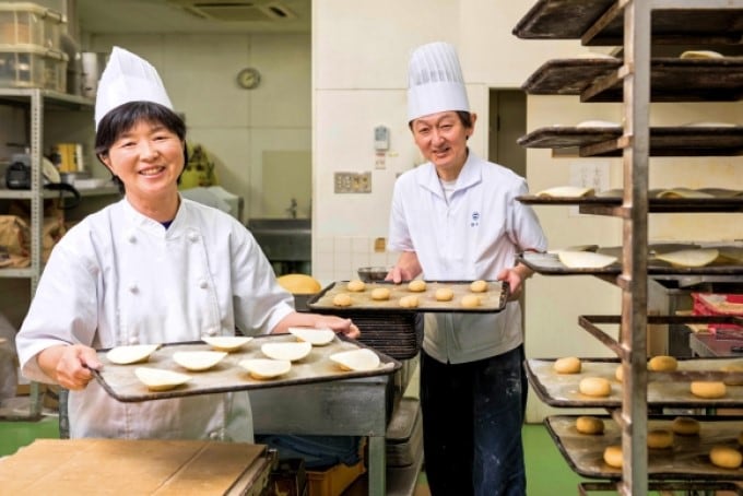 メロンパンの生地にクッキー生地をのせ、時間をかけて膨らませたら窯で焼きます。朝8時にはメロンパンがたくさん焼きあがります。焼きあがったメロンパンに切り込みを入れて、クリームを絞ったら完成! 9時ごろには出来立てがお店に並びます。
