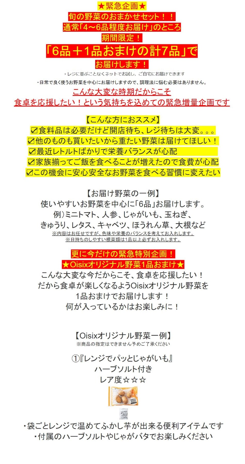 《特別クーポン》【外出自粛応援】【1品おまけ】Oisixおまかせ野菜6品+オリジナル野菜1品