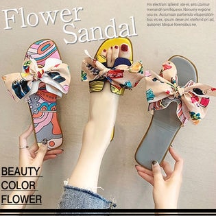 - 【グレー・225mm】リボン飾り花柄プリントサマーサンダル