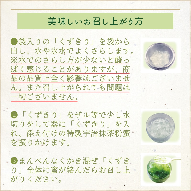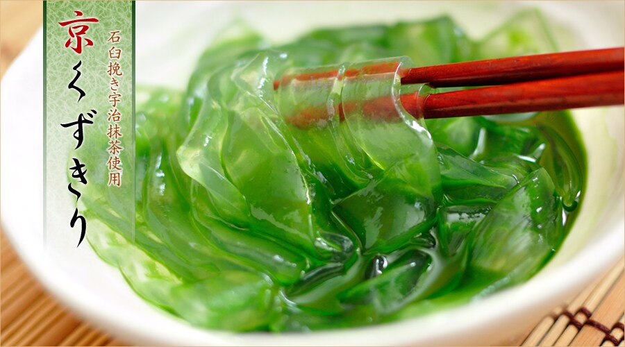 ひとくち食べるごとに、鮮烈なほどの宇治抹茶の香りが広がり、ほんのりとした甘さと爽やかで心地よい苦味。高級抹茶ならではの雅な風味が、くずきりと相まって「和」の心をくすぐります。石臼挽き宇治抹茶の香りとツルンッとした独特の食べごこち、心癒される風味を是非お楽しみください。