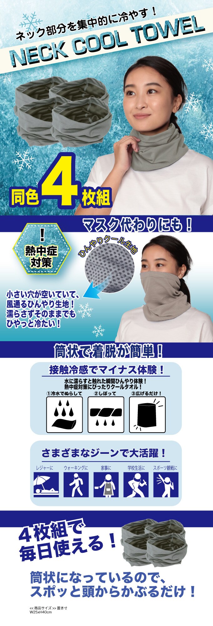 【4枚組/グレー】ネック専用クールタオル 同色4枚組 | ネック部分を集中的に冷やす!スポッと頭からかぶるだけ!