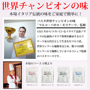 マルコ氏。世界コンクール優勝をはじめ、数々の国際コンクールで優勝しているマルコシェフ監修のパスタソースです。