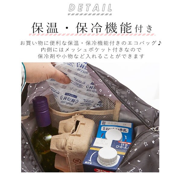 エコバッグ、保冷ジェルを入れるメッシュポケット付きのバッグです。薄型、軽量なので折りたたんで小さく持ち運べます。保温保冷で、サイズは大きめ、ファスナー付き。保冷ジェルなどを入れられるメッシュのポケットが付いているので便利です。