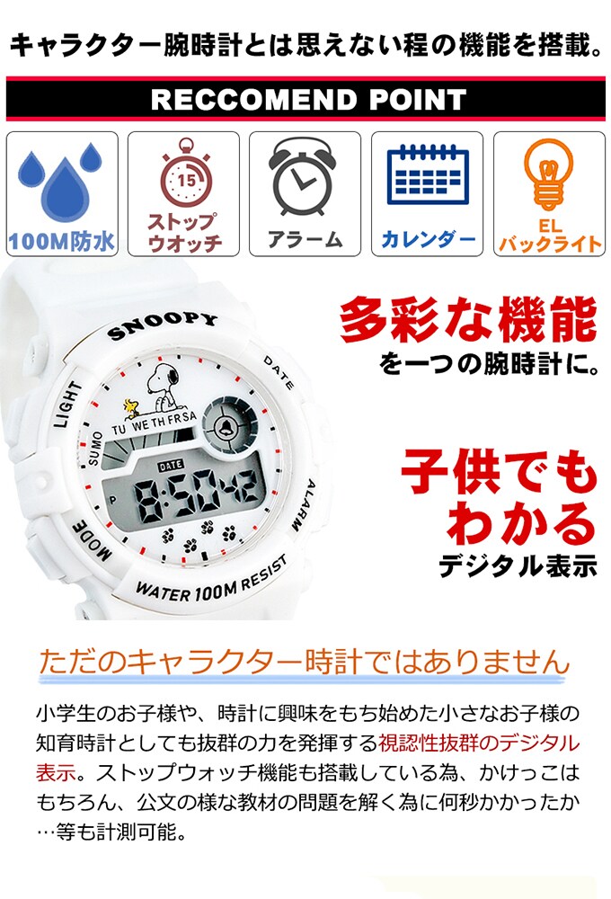 スヌーピーが持つ遊び心いっぱいの世界感と日常の生活に必要な機能が融合した自由でクリエイテブなデザイン。ベルトにはラバーを使っていますので頑丈で壊れにくい構造。フェイス周りのデザインは衝撃を吸収しやすくなっていますので動きが多いお子様にもオススメ。