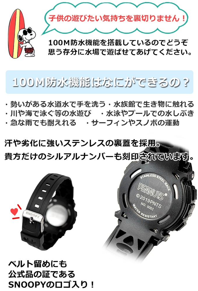 100M防水【デジタル表示 ラバーベルト キッズ 腕時計】スヌーピー レディース メンズ | スヌーピー腕時計シリーズでも珍しい100M防水を搭載しているスポーティーモデルウォッチ。