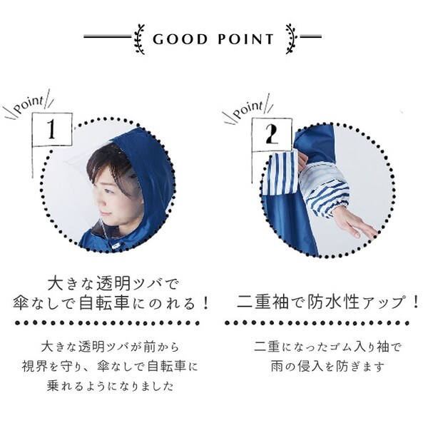 雨の日も自転車に乗りたい方へオススメのレインポンチョです。大きめの透明ツバで視界も良好!傘なしで自転車に乗れます♪裾がしぼれてまくれ上がりを防止します。フロントジッパーで着脱も楽々♪大きめの袖はハンドルごと覆うので雨から手を守ります。