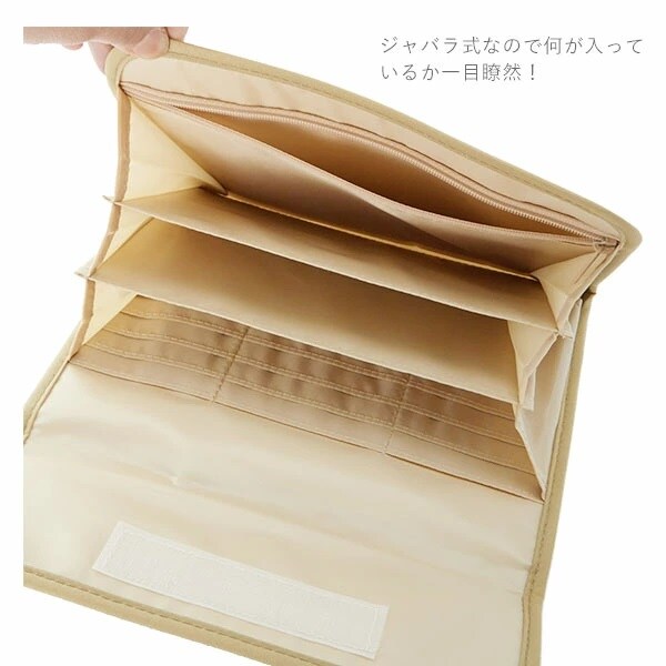 保険証や母子手帳、診察券もこんなケースにまとめておけば、おでかけの時にさっと持ち出せて便利です。ジャバラ式だから何が入っているか見えやすく、ワンタッチテープで開け閉めしやすい。ファスナーポケットやカード入れも充実しているから、母子手帳ケースとしてだけでなく、通帳ケースとしてOLさんにもオススメです。