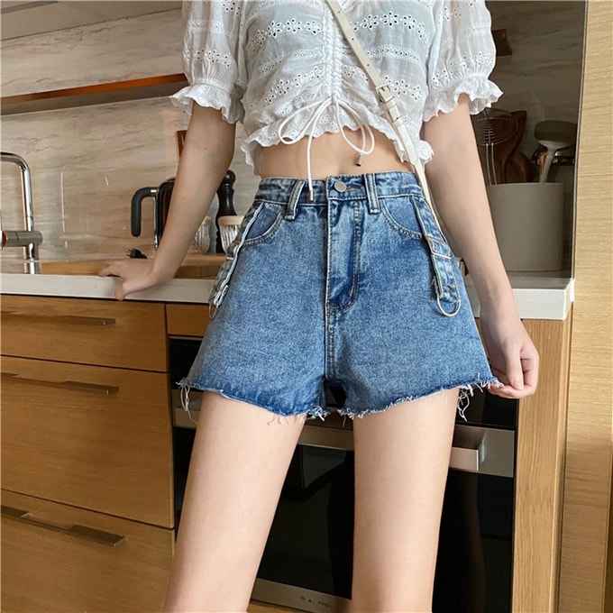【ブルー/L】レディース ボトムスパンツショーパンハーフパンツショートパンツシンプル | ハイウエスト仕様が自然なスタイルアップを叶えるショートパンツ。