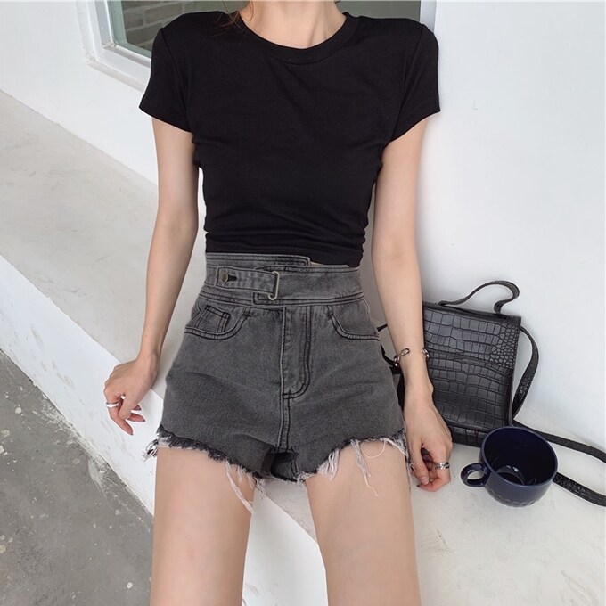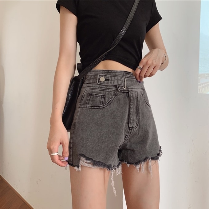 【グレー/M】レディースボトムスパンツデニムシンプルデニムカジュアルカットオフショートパンツ | ボタンベルトがお洒落なアクセントになったショートパンツ。