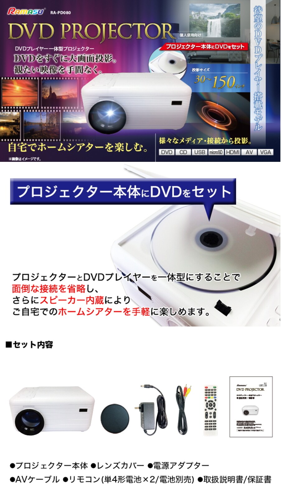 DVDプレーヤー一体型プロジェクター RA-PD080 | DVDをすぐにダイレクトで大画面投影!観たい映像を手間なく!