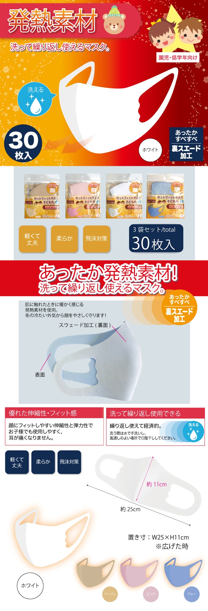 【3枚入り×10袋/ベージュ】子ども用ホットフィットマスク同色30枚組 | あったか発熱素材!洗って繰り返し使える子ども用マスク便利なマスクケース付き!