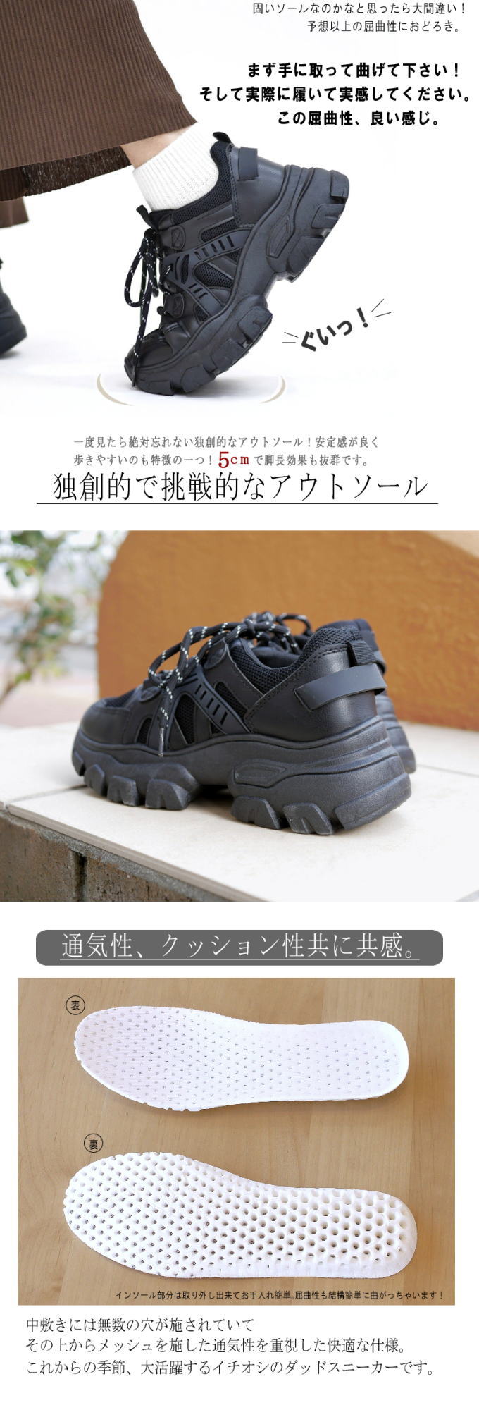 かかとのソール高が5.0cmの厚底フラットです
