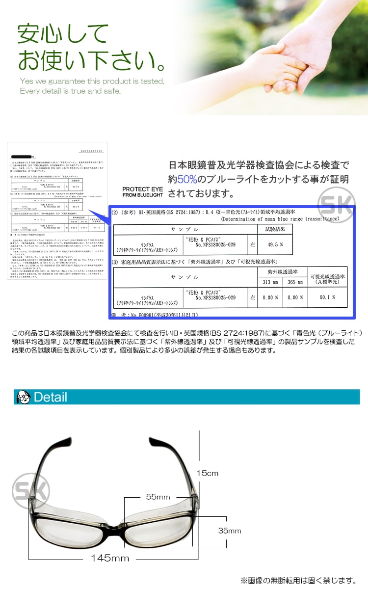 普段は眼鏡を嫌がるお子様でも、サイドにスヌーピーのかわいいシルエットがある花粉対策メガネなら喜んでかけてくれるはず!更に現代の親ならほとんどの方が悩んでいると言われているお子様の長時間のゲームTVの鑑賞。このメガネは画面から発せられる目に有害とされるブルーライトカット機能も搭載しました。このメガネをかけるだけで画面から発せられるブルーライトから目を守ってくれます!
