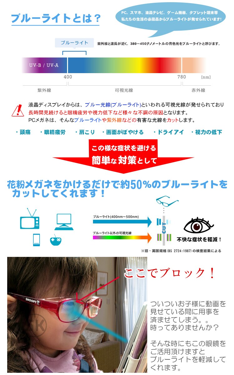 普段は眼鏡を嫌がるお子様でも、サイドにスヌーピーのかわいいシルエットがある花粉対策メガネなら喜んでかけてくれるはず!更に現代の親ならほとんどの方が悩んでいると言われているお子様の長時間のゲームTVの鑑賞。このメガネは画面から発せられる目に有害とされるブルーライトカット機能も搭載しました。このメガネをかけるだけで画面から発せられるブルーライトから目を守ってくれます!