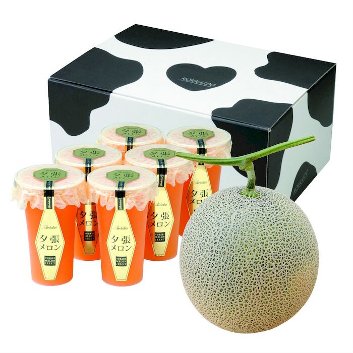 北海道産の大玉メロンと夕張メロンならではの芳醇な香りと独特の風味を再現したゼリーとのセットです。北海道らしい牛柄の化粧箱でお届けいたします。