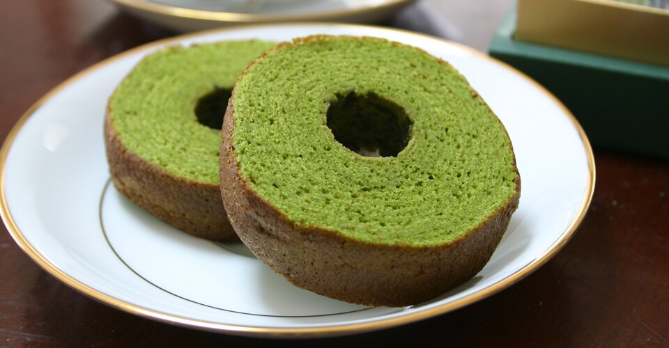 【抹茶バームクーヘン】低温で抹茶の色と香りを引き立たせるために、低温でじっくり焼き上げた、少し固めのオールドタイプのバームクーヘンです。個包装で食べやすいお茶菓子です。