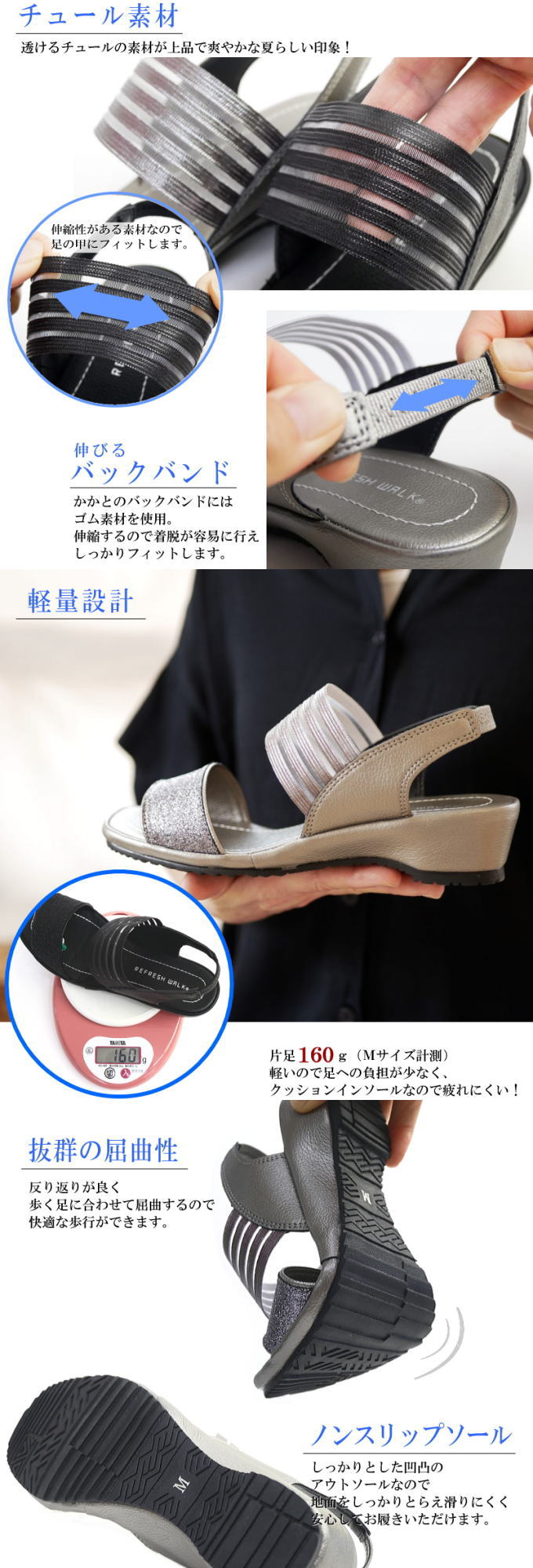 REFRESH WALK [リフレッシュウォーク]・セクエルサンダル | 輝くセクエルと透け感のあるチュール素材が上品で爽やか♪
