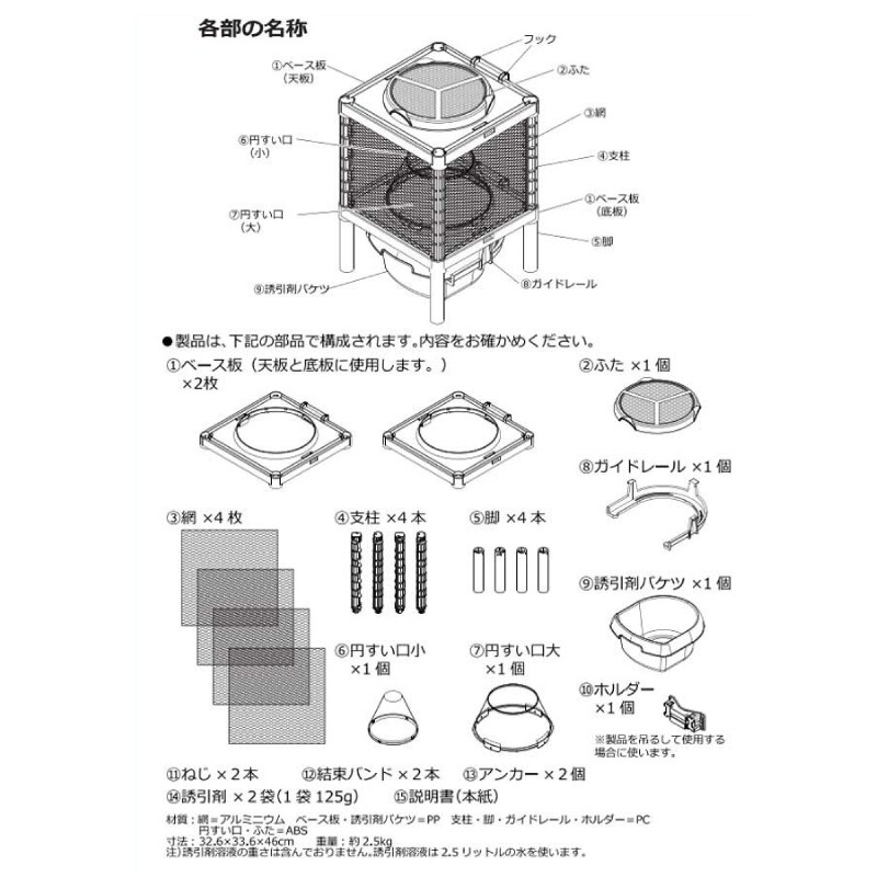 - 本体、吊り下げ用ロープ、壁固定用ホルダー、ビス・アンカー(2セット)、誘引剤バケツ、専用誘引剤(約1.5ヶ月分)