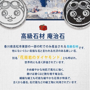 【庵治石】とは、香川県高松市東部の一部の町でのみ産出される高級石材です。 風化に耐え、繊細な細工も可能な細やかな石質が特徴で、古くから墓石材、石灯籠などの細工物に利用されてきました。 高価な石と言われる庵治石は、別名「花崗岩のダイヤモンド」とも呼ばています。