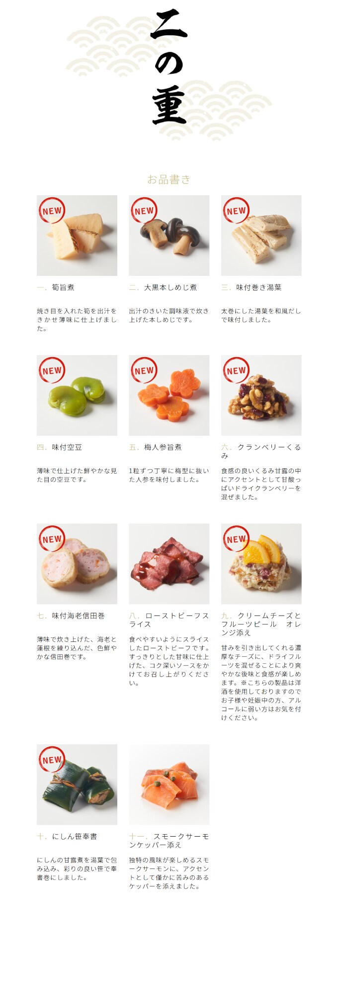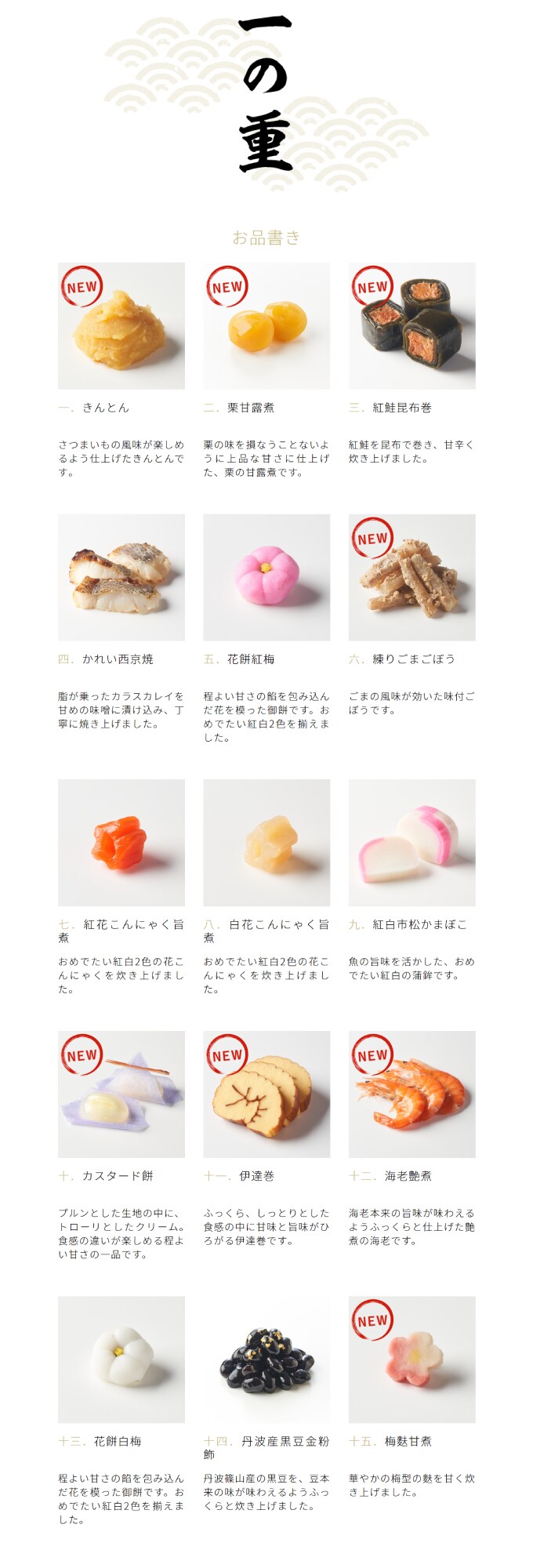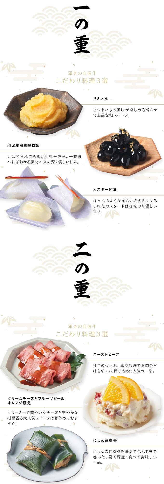 きんとん、栗甘露煮、紅鮭昆布巻、かれい西京焼、花餅紅梅、練りごまごぼう、紅花こんにゃく旨煮、白花こんにゃく旨煮、紅白市松かまぼこ、カスタード餅、伊達巻、海老艶煮、花餅白梅、丹波産黒豆金粉飾、梅麩甘煮、筍旨煮、大黒本しめじ煮、味付巻き湯葉、味付空豆、梅人参旨煮、クランベリーくるみ、味付海老信田巻、ローストビーフスライス、クリームチーズとフルーツピール オレンジ添え、にしん笹奉書、スモークサーモンケッパー添え