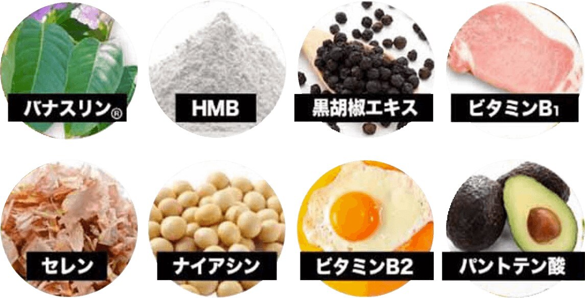 難消化性デキストリン(水溶性食物繊維)、還元麦芽糖、甘藷若葉粉末、ブドウ種子抽出物、キャンドルブッシュ粉末、セレン含有酵母、スピルリナ粉末、バナバ葉抽出物、黒胡椒エキス末、殺菌乳酸菌粉末、HMBCa、クレアチン、オレンジ抽出物、カシス抽出物/二酸化ケイ素、ナイアシン、ステアリン酸Ca、パントテン酸Ca、ビタミンB2、ビタミンB1、香辛料抽出物