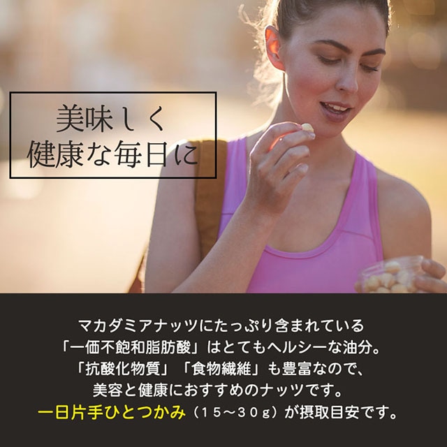 マカダミアナッツにたっぷり含まれている「一価不飽和脂肪酸」はとてもヘルシーな油分。「抗酸化物質」「食物繊維」も豊富なので、美容と健康におすすめのナッツです。一日片手ひとつかみ(15gから30g)が摂取目安です。